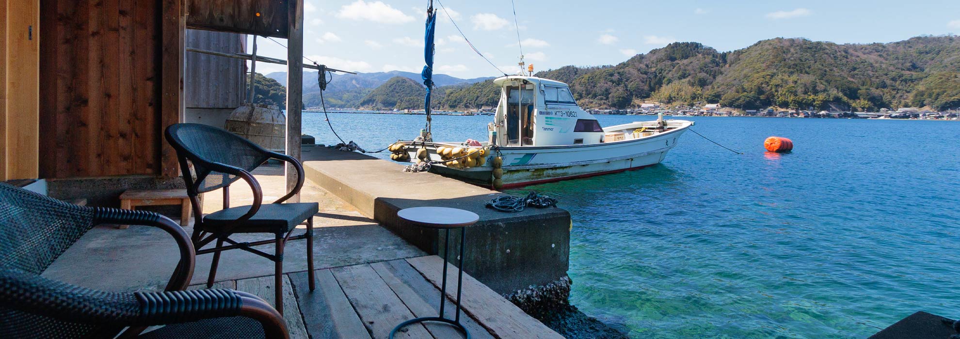 > 詳細はこちら長年漁船が出入りする舟屋として使用されていた1階部分がダイニングルームとなっております。舟屋ビューはもちろんのこと、一歩踏み出すと伊根ブルーが広がっています。海の底まで見通せる透き通る水は空の青さを映し出し鮮やかな青に染まります。