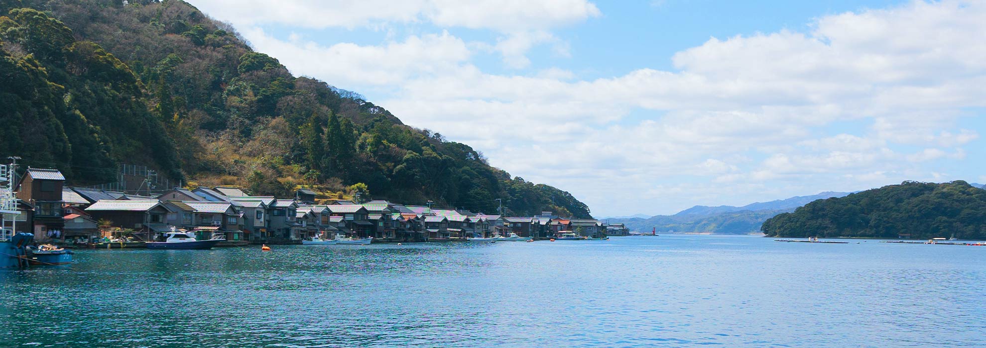 湾の入り口には天然の防波堤のように青島があり、日本海側でも少ない開口部を南に向けた形状の伊根湾。 その形状と年間を通して潮の満ち引きの差が少ないこと、また海が急に深くなっていることから波が立ちにくい形状となっており湾内は年中を通して穏やかである。 その湾にを取り囲むように水際ぎりぎりに切妻面を向けた建物が伊根の舟屋である。