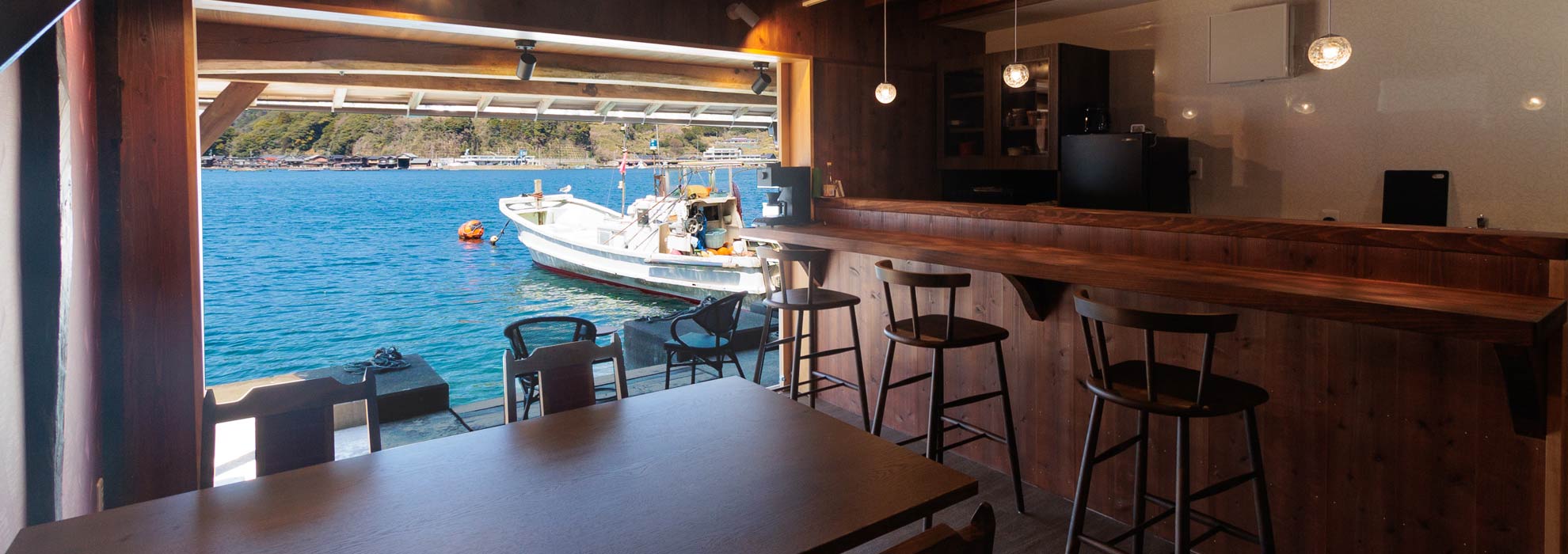 長年漁船が出入りする舟屋として使用されていた1階部分がダイニングルームとなっております。 宿泊の際はダイニングルームとして、お客様がチェックアウトされれば「カフェあっちゃん」としてお客様に開放する予定です。伊根の“よりどころ”として愛されるように... ※カフェとしてのオープンは只今準備中です。