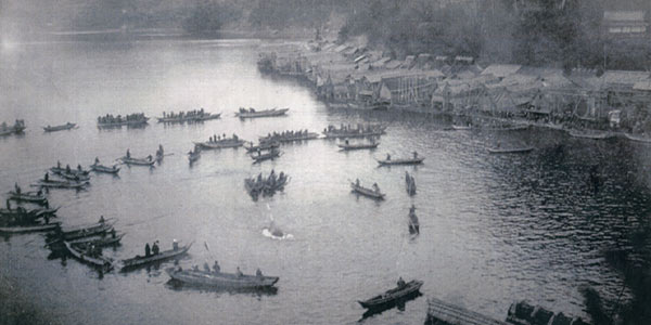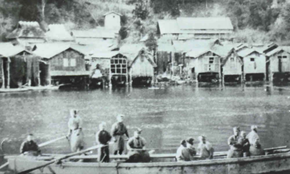 豊富な漁場でもあった伊根湾、古くは湾内での 鰤漁が盛んであった。 また湾内に紛れ込んだ鯨を町の漁師が総出で追い 込む鯨漁も大正の初期まで行われていた。 当時は、町のほとんどが漁師で生計をたてており 大事な船を収納する船のガレージとして江戸の 中期ごろから舟屋は存在していたと言われている。 当時の漁船はエンジンなどは無く小型の木造船。 船の劣化を防ぐためにも毎日船を舟屋の中に引き 上げる必要があったのである。 舟屋は水際いっぱいに建ち一階が船の収納、二階は 漁具の保管庫として利用されてきた。 舟屋の一階の柱は比較的水に強い椎の木が使用されて おり二階の梁には粘りがある地元の松の木が使用され ている。古くは茅葺の舟屋だったものが生活スタイルの 変化、船の大型化により現在のような瓦葺の二階建てに なったのは昭和初期からである。 現在でも船の収納、漁具の保管庫また二階は住居としても 伊根の住民にとって舟屋は無くてはならないものとして代々 大切に受け継がれている。 伊根の舟屋は漁村では全国で初めて国の重要的伝統建造物 保存地区の選定を受けた。